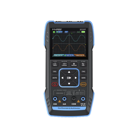 El FNIRSI-2C23T es un osciloscopio digital de doble canal 3 en 1 versátil, diseñado para trabajos de mantenimiento y desarrollo. Combina un osciloscopio, un multímetro y un generador de señales en un solo dispositivo. El osciloscopio cuenta con una arquitectura FPGA+MCU+ADC, una tasa de muestreo de 50 MS/s, un ancho de banda de 10 MHz y protección contra alta tensión, soportando mediciones de voltaje pico de hasta 400V. Permite guardar y analizar capturas de pantalla de formas de onda.