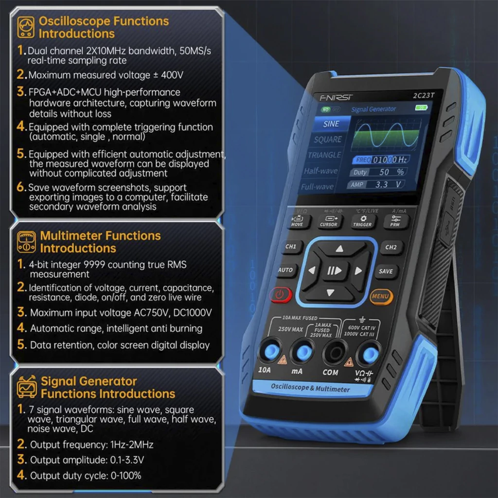 FNIRSI 2C23T MULTIMETRO OSCILOSCOPIO GENERADOR SEÑAL 2 CANALES 3 EN 1.