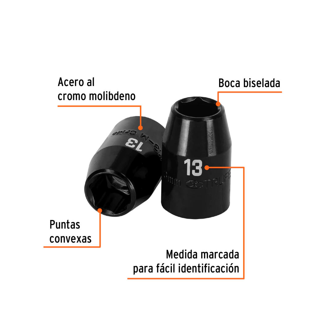 - Sistema de sujeción Truper-Drive con puntas convexas que aseguran y aumentan el torque sin dañar tuercas ni cabezas de tornillos.